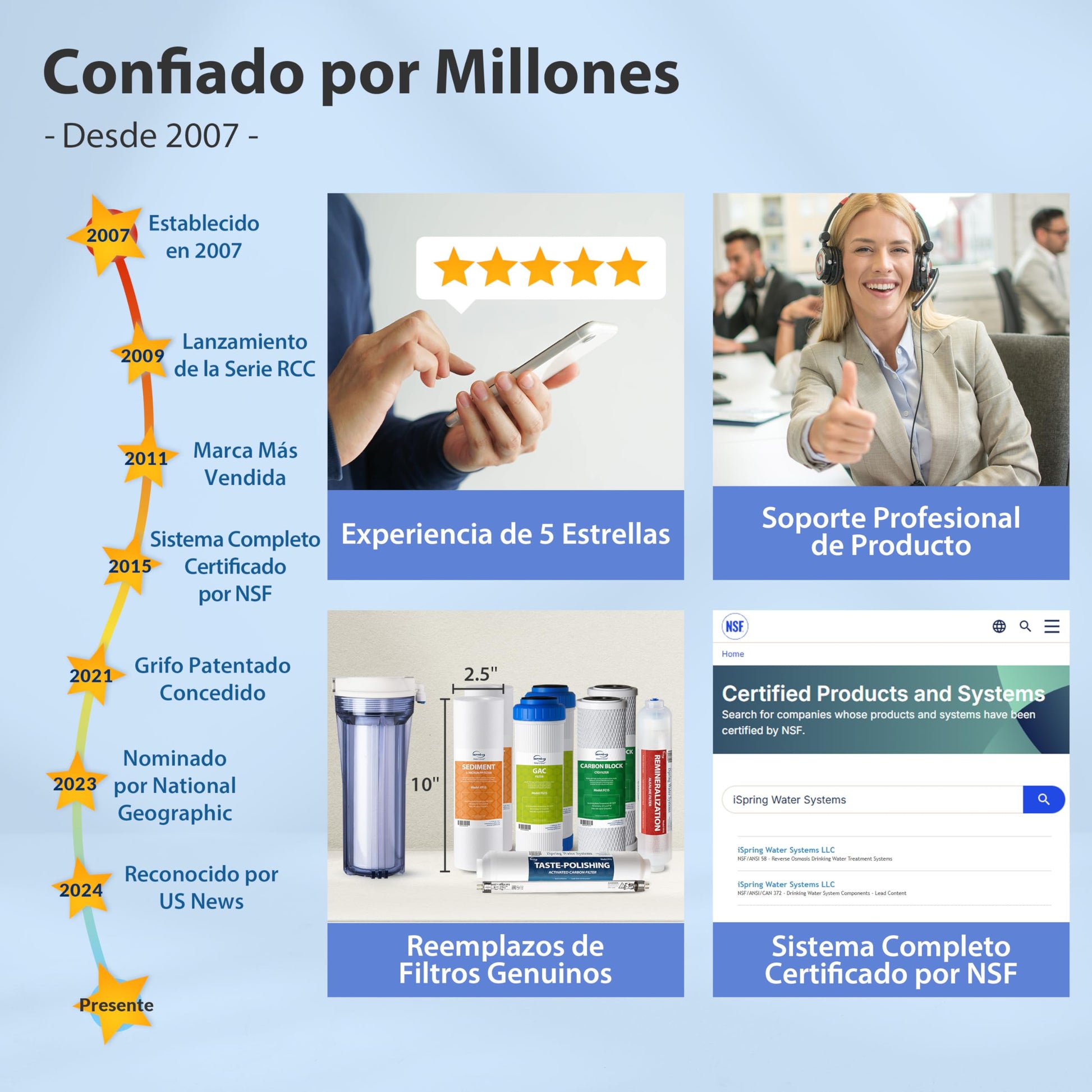 - ÓSMOSIS INVERSA CON CERTIFICACIÓN NSF 58: A diferencia de otras marcas que no cuentan con certificación NSF ni certificación de sistema completo, nuestro RCC7AK cuenta con la certificación NSF/ANSI 58 y 372 para todo el sistema de filtro de agua.